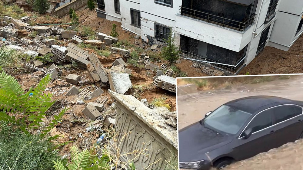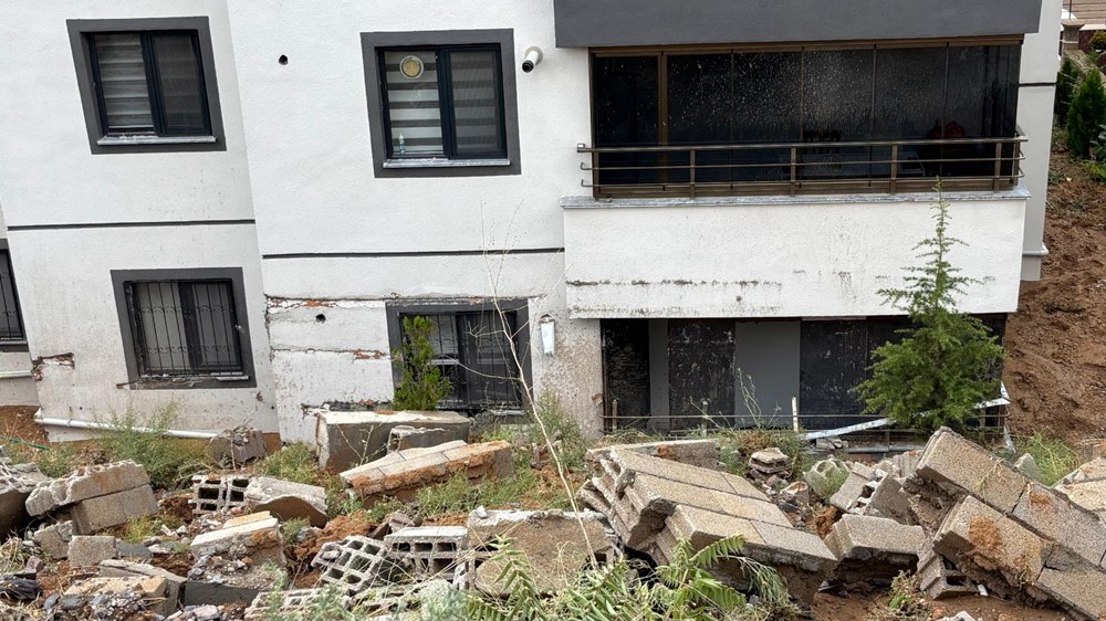 Gölbaşı’ndaki Seğmenler Mahallesi’nde de üç katlı bir apartmanın istinat duvarı büyük bir gürültüyle yıkıldı.