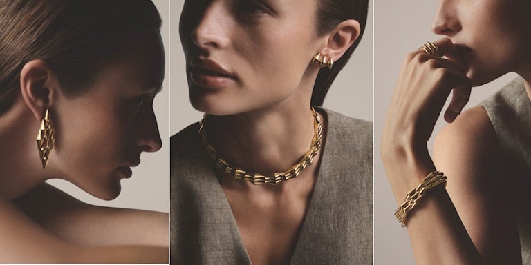 Serinin merkezindeki bilezik, arşiv modelini doğrudan referans alıyor. Altın dalga bileği sararken, eşkenar dörtgen modüller görünmez esnek bağlantılarla bir araya geliyor; yapı hem hareket hem de uyum üzerine kuruluyor. Aynı modüler yaklaşım kolyede boyun hattını saran akışkan bir çizgiye, yüzükte ise beş bantlı katlanabilir bir forma dönüşüyor. Küpelerde ise dikeylik öne çıkıyor; sallantılı formlar ve modüler ızgara yapıları sarı altının sıcak tonunu vurguluyor. Tek ve özgün ear-cuff versiyonu, koleksiyonun daha cesur yüzünü temsil ediyor.