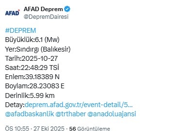 AFAD’dan yapılan depremin büyüklüğü 6,1 olarak duyurulurken derinliğin ise 5,99 kilometre olduğu kaydedildi.