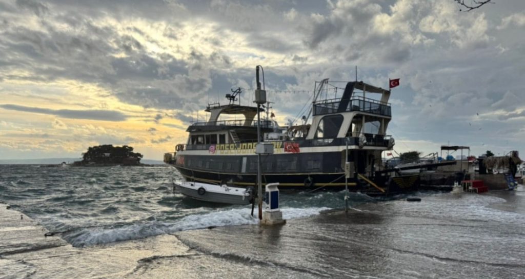 Marmara Bölgesi’ni etkisi altına alan lodos, Balıkesir’in Erdek ilçesinde de hayatı olumsuz etkiledi. Saatteki hızı 70 kilometreye ulaşan lodosta yüksek dalgalar nedeniyle denizle kara birleşti.