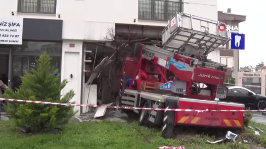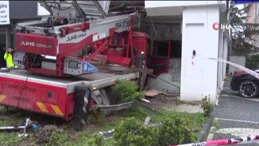 İstanbul’un Büyükçekmece ilçesi Fatih Mahallesi’nde öğle saatlerinde yokuş aşağı inen sepetli vinç, sürücüsünün kontrolünden çıkıp önce bir araca çarparak sürüklendi ardından da refüje çıkıp diş hekimliği polikliniğine daldı.