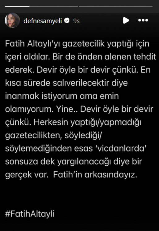 Gazeteci Fatih Altaylı’nın dün akşam saatlerinde gözaltına alınmasına sanat dünyasından tepkiler gelmeye devam ediyor. Altaylı’ya son destek mesajı oyuncu ve şarkıcı Defne Samyeli’den geldi.