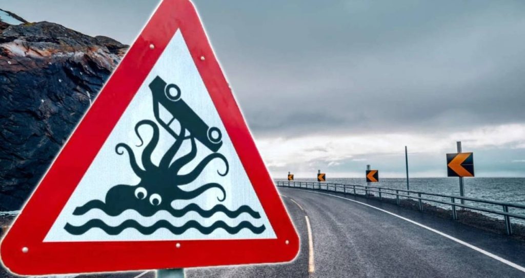 İnternette sıkça paylaşılan bu tabela, birçok kişi tarafından efsanevi deniz yaratığı Kraken’e benzetiliyor. Ancak levhanın anlamı oldukça basit. İşaret, sürücülere denize çok yaklaşıldığını ve yolun suya yakın bir noktadan geçtiğini hatırlatmayı amaçlıyor. Herhangi bir tehlikeli deniz canlısına işaret etmeyen levha, buna rağmen ilginç tasarımı sayesinde bölgenin simgelerinden biri haline geldi.