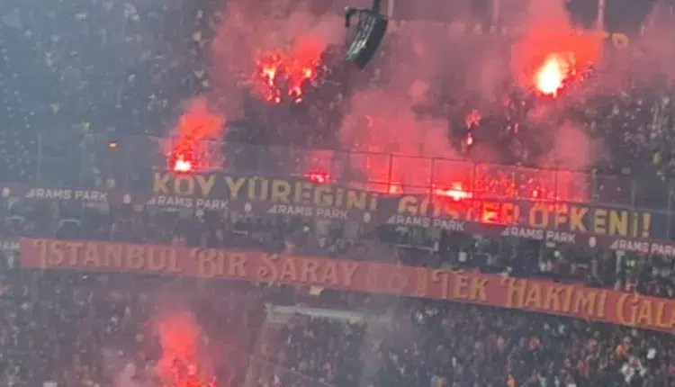 Deplasman tribününden Galatasaray seyircisi üzerine yağan meşaleler nedeniyle Sloven hakem oyunu bir süre durdurdu.