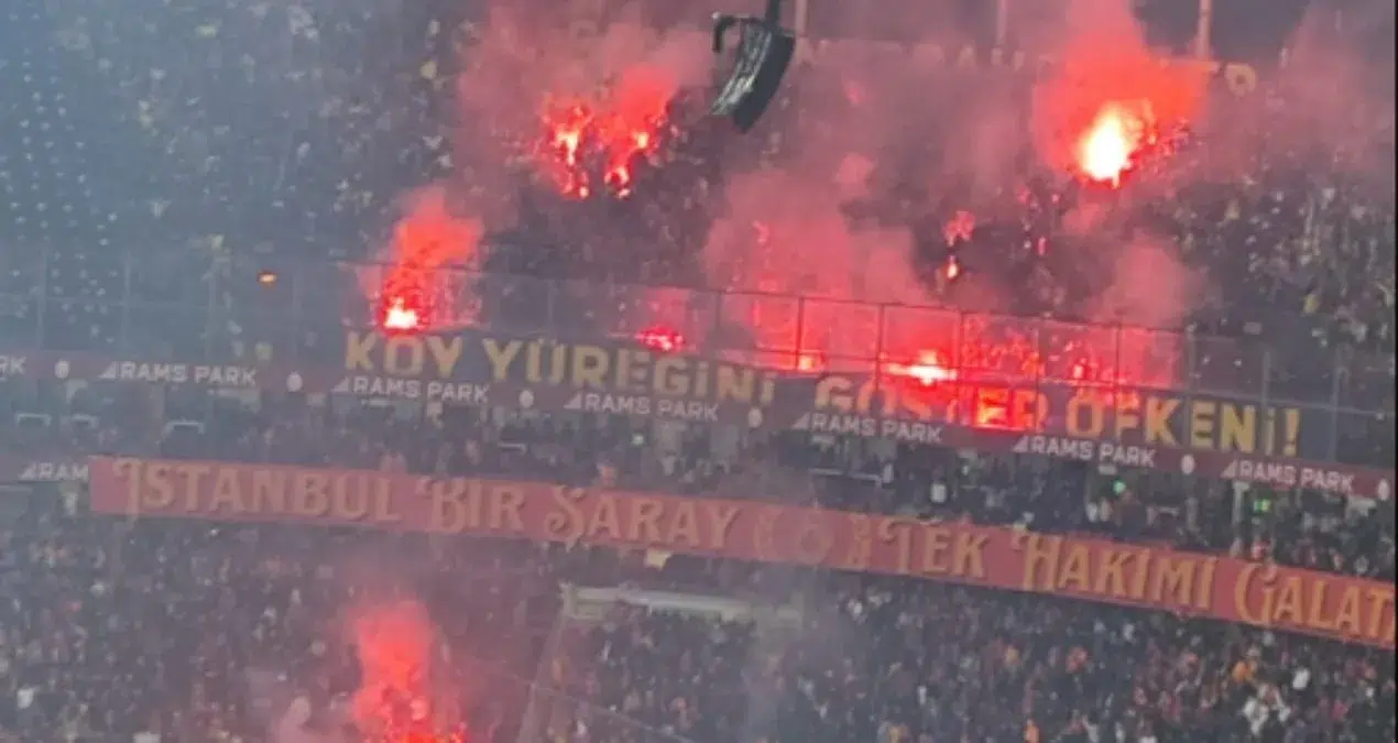 Karşılaşmanın ikinci yarısı oynanırken sarı lacivertli taraftarlar ardı ardına meşaleler yaktı. Sarı lacivertliler bazı meşaleleri sarı kırmızılı tribünün olduğu bölüme doğru fırlattı.