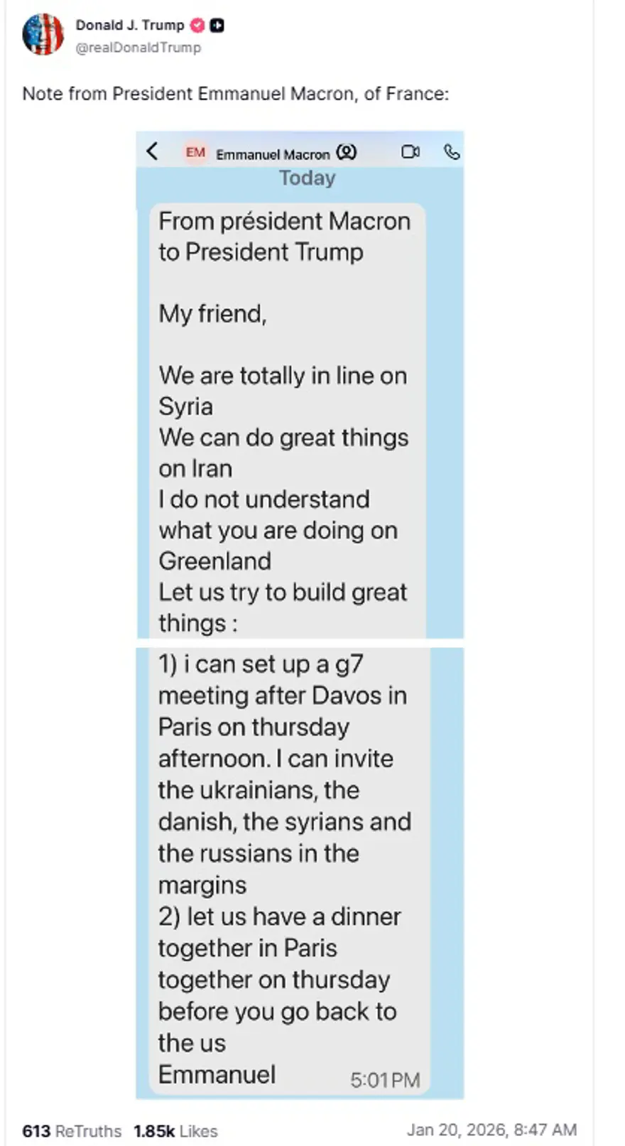 Trump, Fransa Cumhurbaşkanı Emmanuel Macron’un kendisine gönderdiği mesajın ekran görüntüsünü sosyal medya platformu Truth’ta paylaştı.