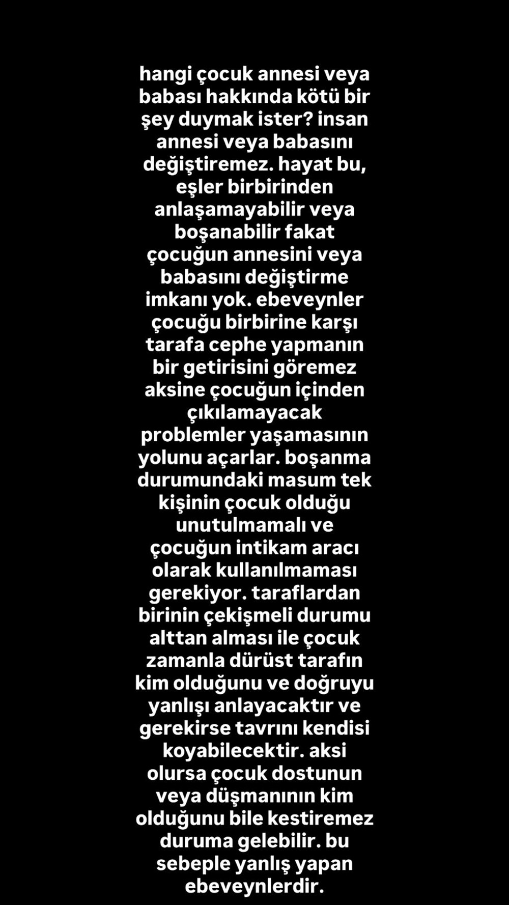 Çocukları Selin ve Emir’e duyduğu özlemi dile getire Duran, “Hangi çocuk annesi veya babası hakkında kötü bir şey duymak ister? İnsan annesi veya babasını değiştiremez. Hayat bu, eşler anlaşamayabilir veya boşanabilir fakat çocuğun annesini veya babasını değiştirme imkanı yok. Ebeveynler çocuğu birbirine karşı tarafa cephe yapmanın bir getirisini göremez aksine çocuğun içinden çıkılmayacak problemler yaşamasının yolunu açarlar.” dedi.