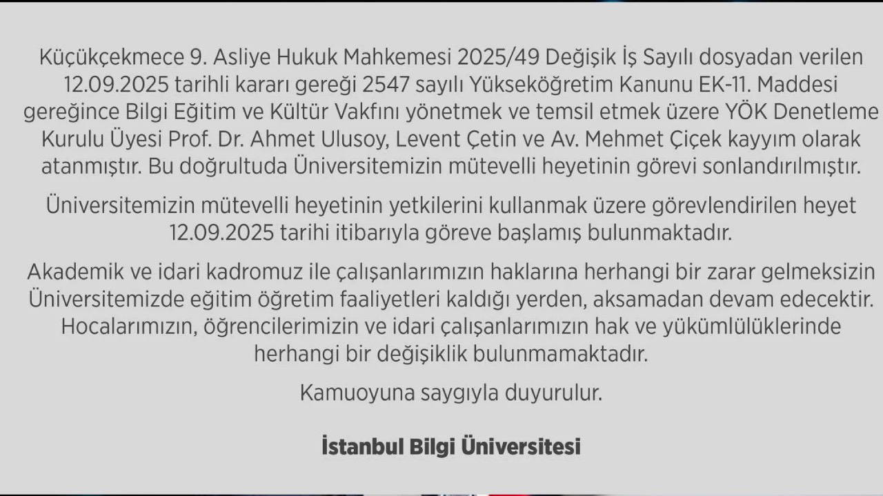 Buna göre, YÖK Denetleme Kurulu Üyesi Prof. Dr. Ahmet Ulusoy, Levent Çetin ve Av. Mehmet Çiçek kayyum olarak görevlendirildi. Üniversitenin mevcut mütevelli heyetinin görevine ise son verildi.