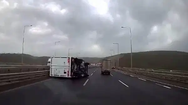 Şiddetli rüzgâr, Kuzey Marmara Otoyolu’nun Dilovası geçişinde kazalara neden oldu. Seyir halindeki iki tır ve bir kamyonet rüzgârın etkisiyle devrildi. Tırın devrildiği anlar güvenlik kamerasına yansırken, kazalarda şans eseri yaralanan olmadı. Görüntülerde, diğer araçların da rüzgâr nedeniyle savrulduğu görüldü.