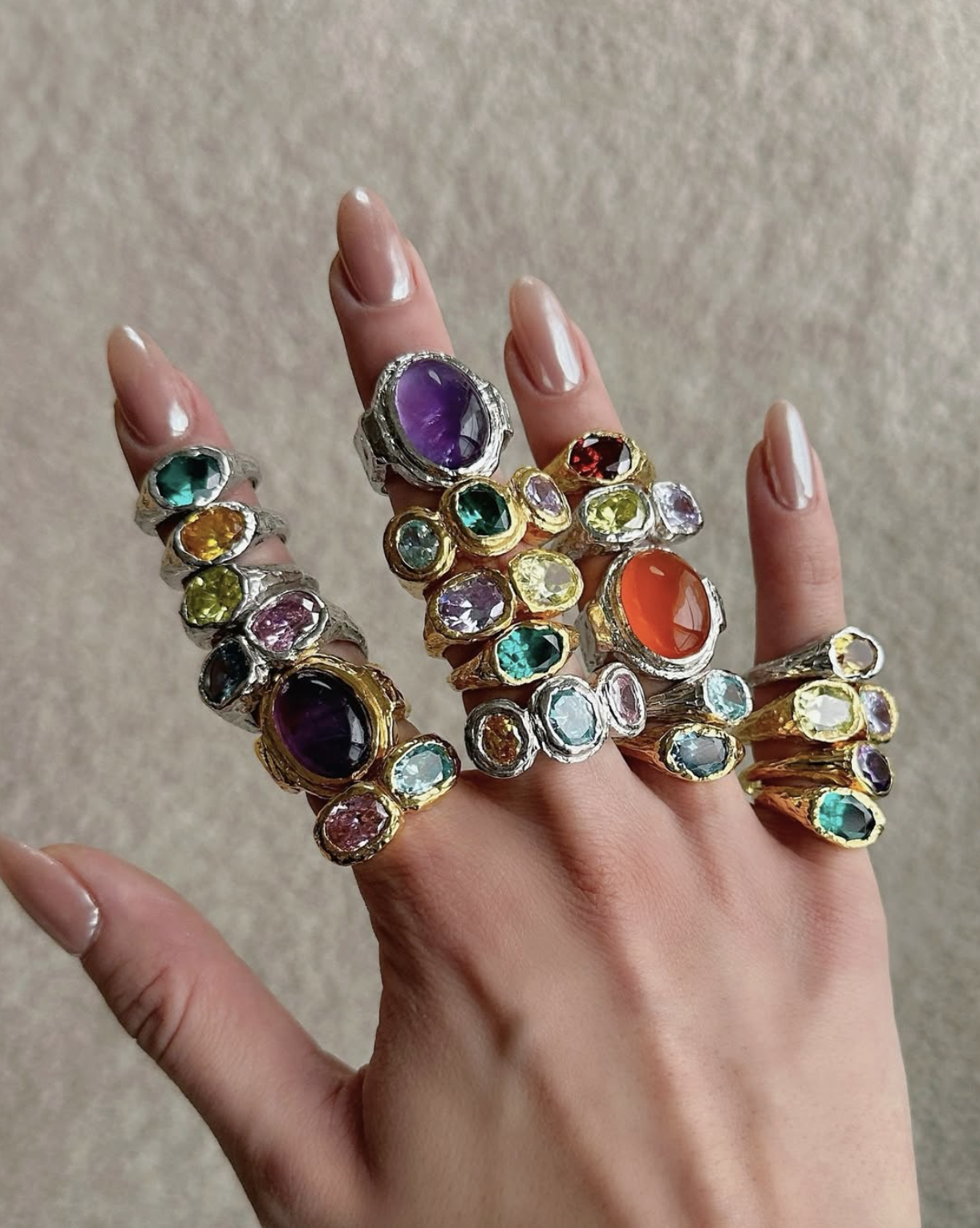 Kişisel olarak renkli tasarımları seviyoruz. Ürünlerimizdeki dinamik ve akışkan hissiyatı renkli taşlarla birleştirerek daha da enerjik ve canlı bir hale getirdiğimizi düşünüyoruz. Renkli taşlar, koleksiyona hayat ve biraz da oyunlu bir enerji katıyor.