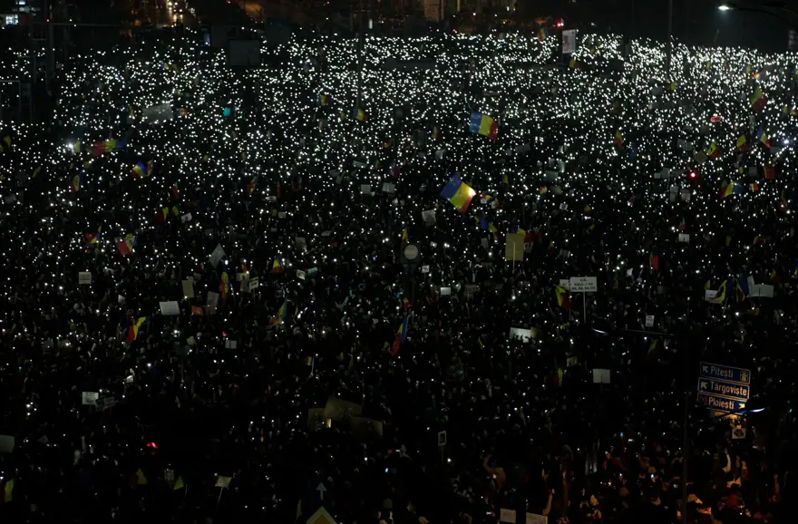 Bükreş’te Üniversite Meydanı’ndan Zafer Meydanı’na yürüyen yaklaşık 10 bin kişilik kalabalık, “Yolsuzluk değil adalet”, “Sizi görüyoruz” ve “İtaat değil bağımsızlık” sloganları attı.