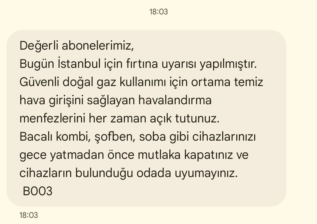 Bugün İstanbul için fırtına uyarısı yapılmıştır. Güvenli doğal gaz kullanımı için ortama temiz hava girişini sağlayan menfezlerinizi her zaman açık tutunuz. Bacalı kombi, şofben, soba gibi cihazlarınızı gece yatmadan kapatınız ve cihazların bulunduğu odada uyumayınız”
