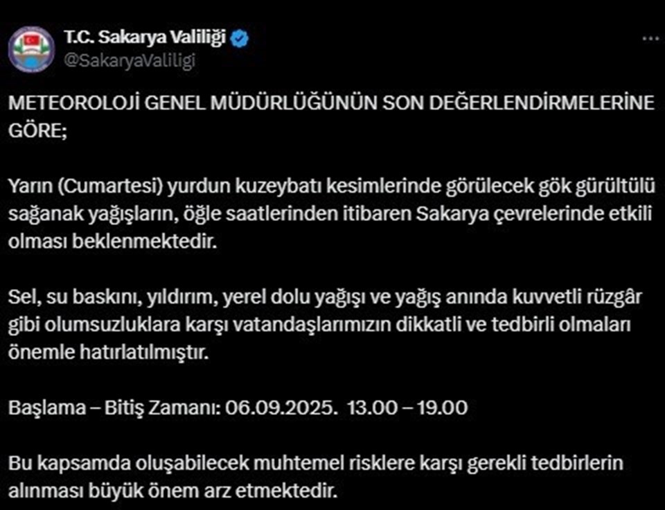 Sel, su baskını, yıldırım, yerel dolu ve yağış anında kuvvetli rüzgar gibi olumsuzluklara karşı dikkatli olunması istendi. Valiliğin sosyal medya hesabından yapılan paylaşımda, “Meteoroloji Genel Müdürlüğü’nün son değerlendirmelerine göre; yarın (Cumartesi) yurdun kuzeybatı kesimlerinde görülecek gök gürültülü sağanak yağışların, öğle saatlerinden itibaren Sakarya çevrelerinde etkili olması beklenmektedir.