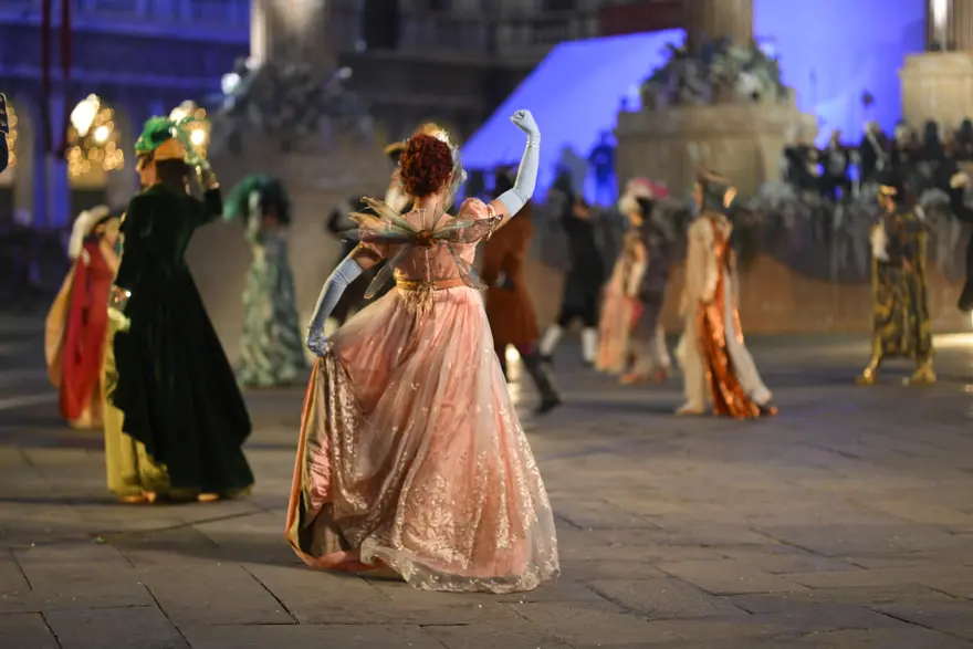 31 Ocak–17 Şubat tarihleri arasında düzenlenen Venedik Karnavalı’nın açılış etkinliğinde, profesyonel dansçılar San Marco Meydanı’nda gösteriler sundu ve izleyicilere eşlik etti.