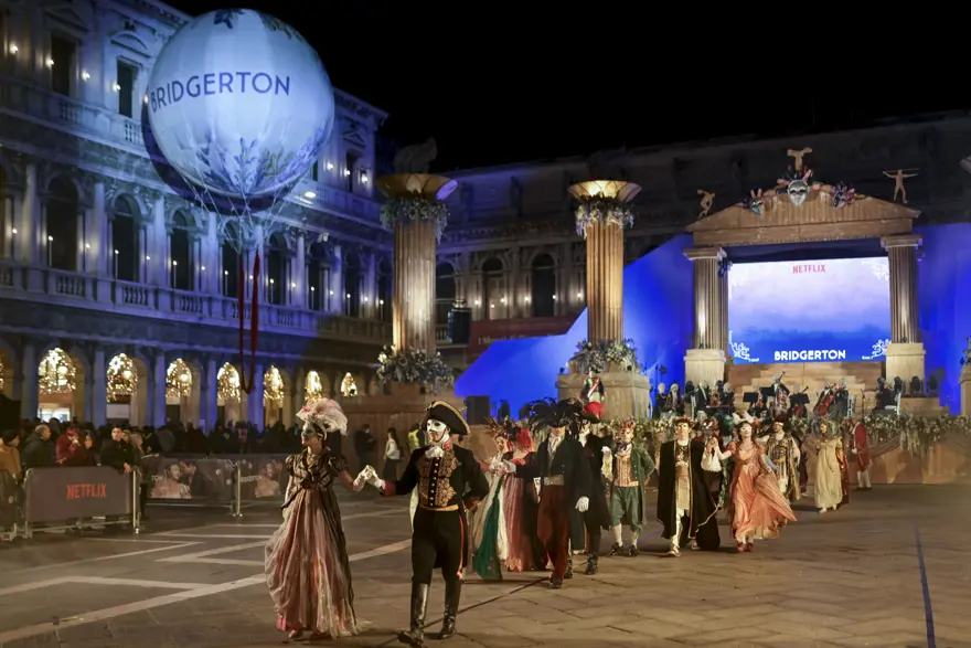 İtalya’nın Venedik kentinde, Bridgerton temalı Büyük Karnaval Balosu, Venedik Karnavalı’nın ilk etkinliği olarak gerçekleştirildi.