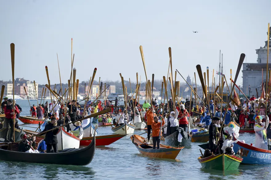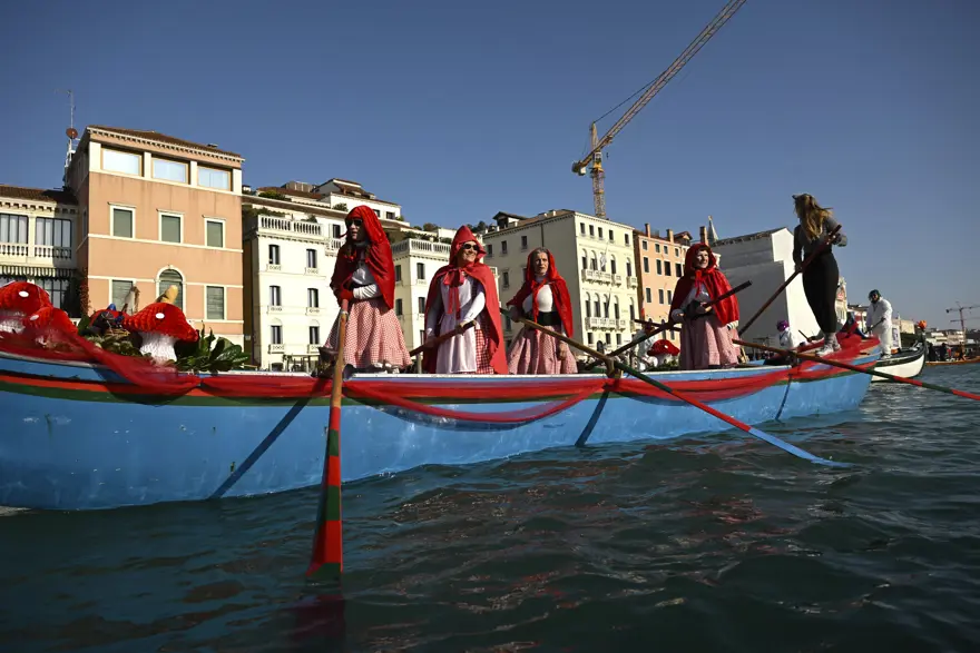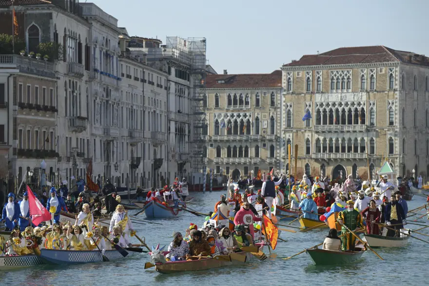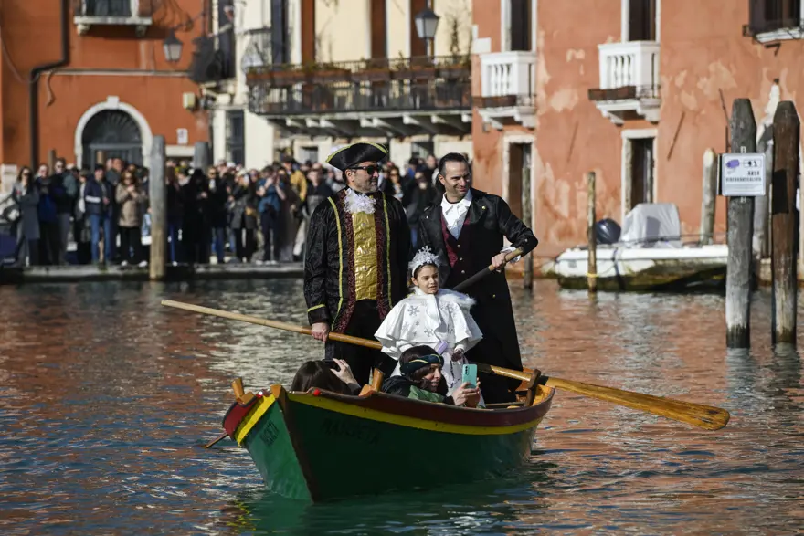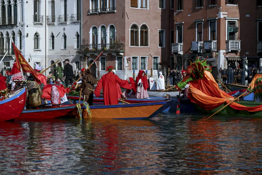 Karnaval kapsamında yüzlerce tekne, maskeli katılımcılar eşliğinde dün Punta della Dogana’dan Rialto’ya kadar uzanan Büyük Kanal’da geçiş yaptı.