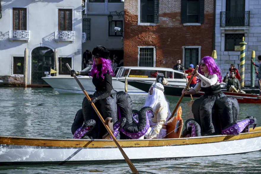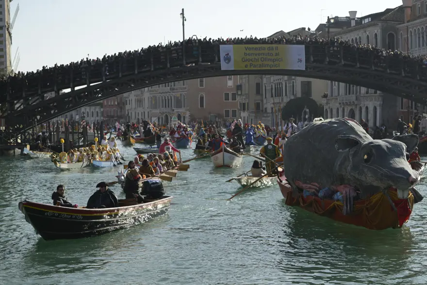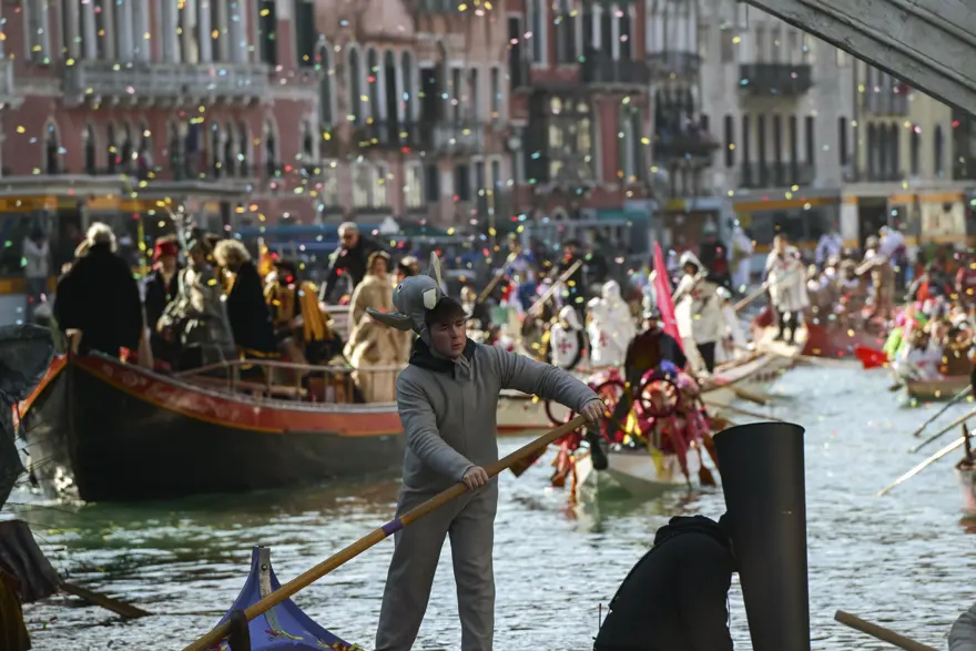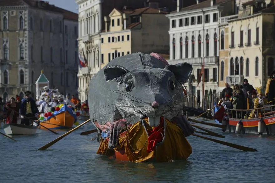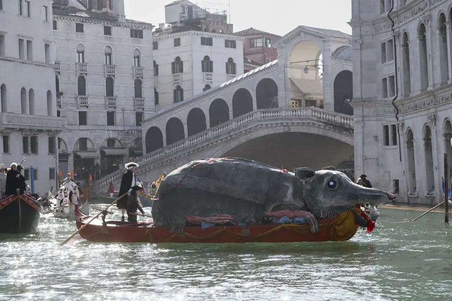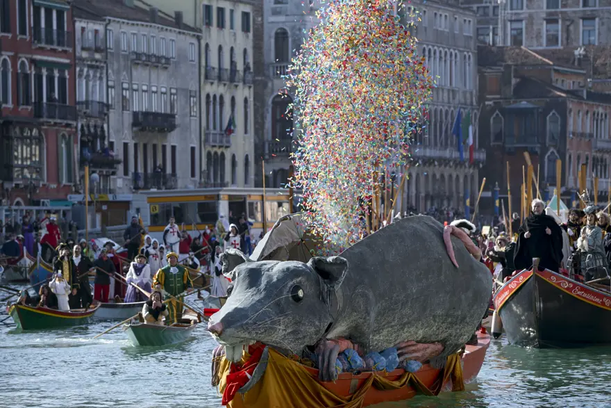 Geçit töreninin öncülüğünü yapan ve üzerinde kağıt hamurundan yapılan “Pantegana” figürü bulunan tekne, Rialto’ya ulaştığında binlerce renkli konfetinin havaya saçılmasıyla gösteri sona erdi.