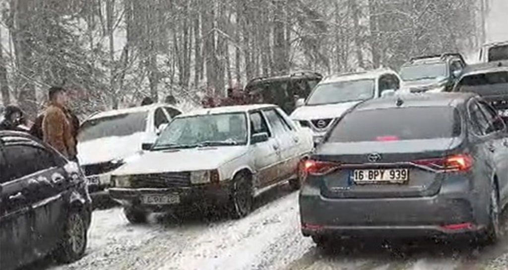 Uzun araç kuyruğu oluşurken, araçlarında kış lastiği olmayan sürücüler ise mahsur kaldı. İnegöl İlçe Jandarma Komutanlığı ekipleri, bölgede trafiği kontrollü olarak sağlıyor.