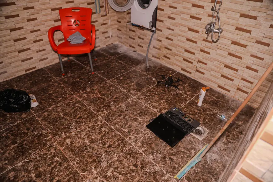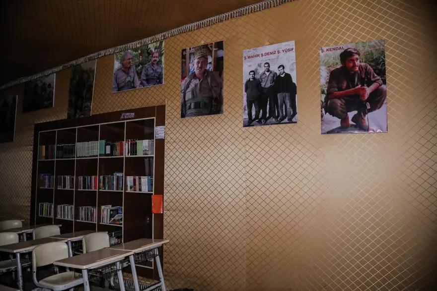Yapının içerisinde örgüt sembollerinin yanı sıra tünellerin kazılması için kullanılan araç ve gereçlerin de sergilendiği görülüyor.