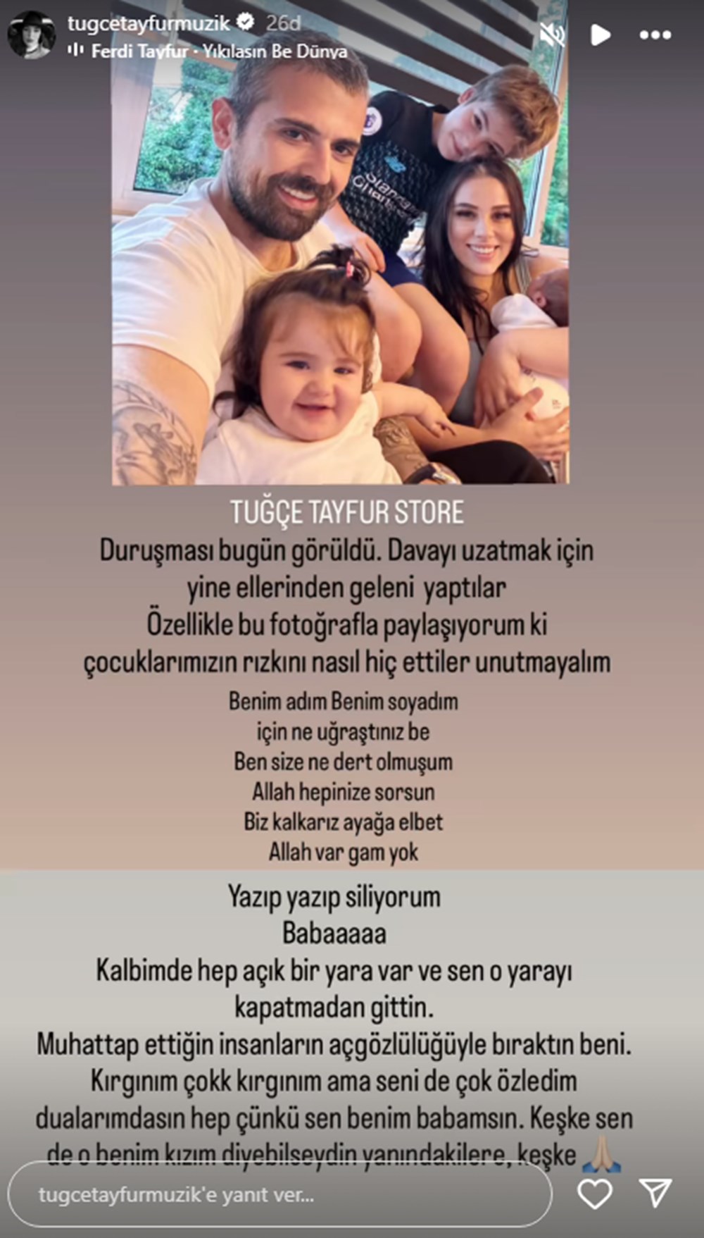 “Benim adım, benim soyadım için ne uğraştınız be. Ben size ne dert olmuşum. Allah hepinize sorsun. Biz kalkarız ayağa elbet, Allah var gam yok. Yazıp yazıp siliyorum. Baba. Kalbimde hep açık bir yara var ve sen o yarayı kapatmadan gittin. Muhatap ettiğin insanların açgözlülüğüyle bıraktın beni. Kırgınım, çok kırgınım ama seni de çok özledim. Dualarımdasın hep çünkü sen benim babamsın. Keşke sen de o benim kızım diyebilseydin yanındakilere, keşke.”